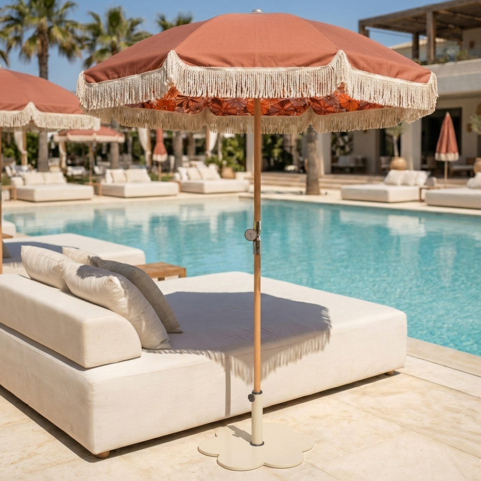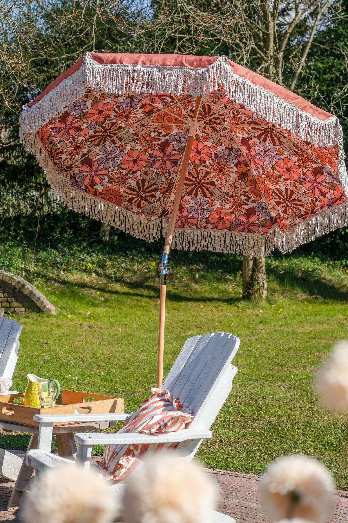 Hij is er weer: onze geliefde bestseller! Met een effen terracotta buitenkant en een vrolijke bloemenprint aan de binnenzijde is deze parasol een echte sfeermaker. De parasol heeft UPF50+ bescherming en een waterdichte afwerking. Dankzij het lichte gewicht neem je hem eenvoudig mee, en zet je hem in no-time op of pak je hem weer in. Perfect voor in de tuin, op je balkon of mee naar de camping. Met het kantelmechanisme creëer je de hele dag door schaduw. Inclusief bijpassende opbergtas. Combineer de parasol met onze parasolvoeten voor een complete set!