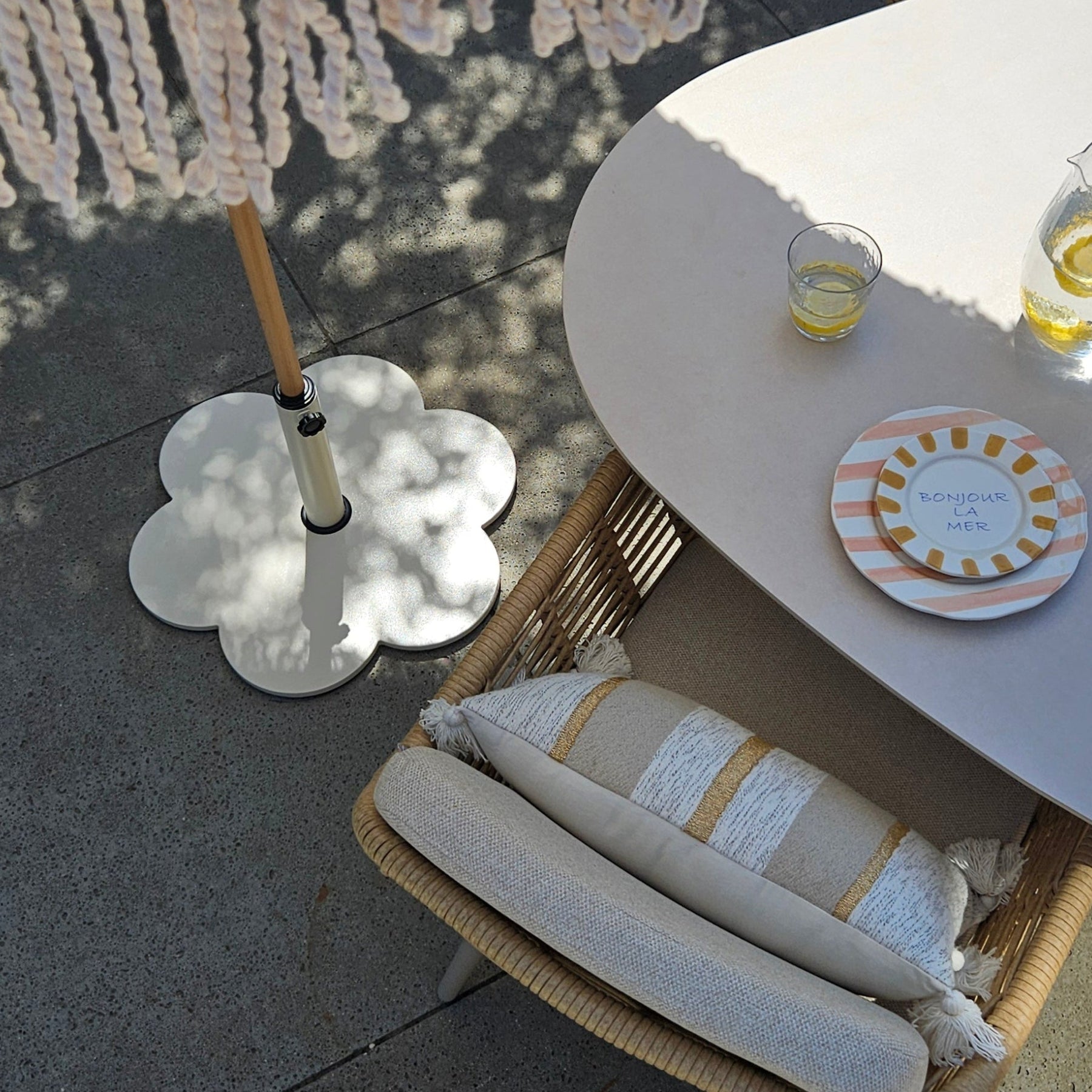 Onze bestseller is weer terug! Deze unieke voet in bloemvorm is een echte blikvanger voor in je tuin. Met een gewicht van 25 kg staat je parasol stevig en stabiel. Het ontwerp is zorgvuldig ontwikkeld zodat onze parasols er perfect in passen. Dankzij de drie meegeleverde adapters is de voet ook geschikt voor andere parasols met verschillende stokdiktes. De kleur van de voet is een perfecte match met onze dubbelzijdige beige gestreepte parasol maar combineert ook prachtig met onze andere parasols.